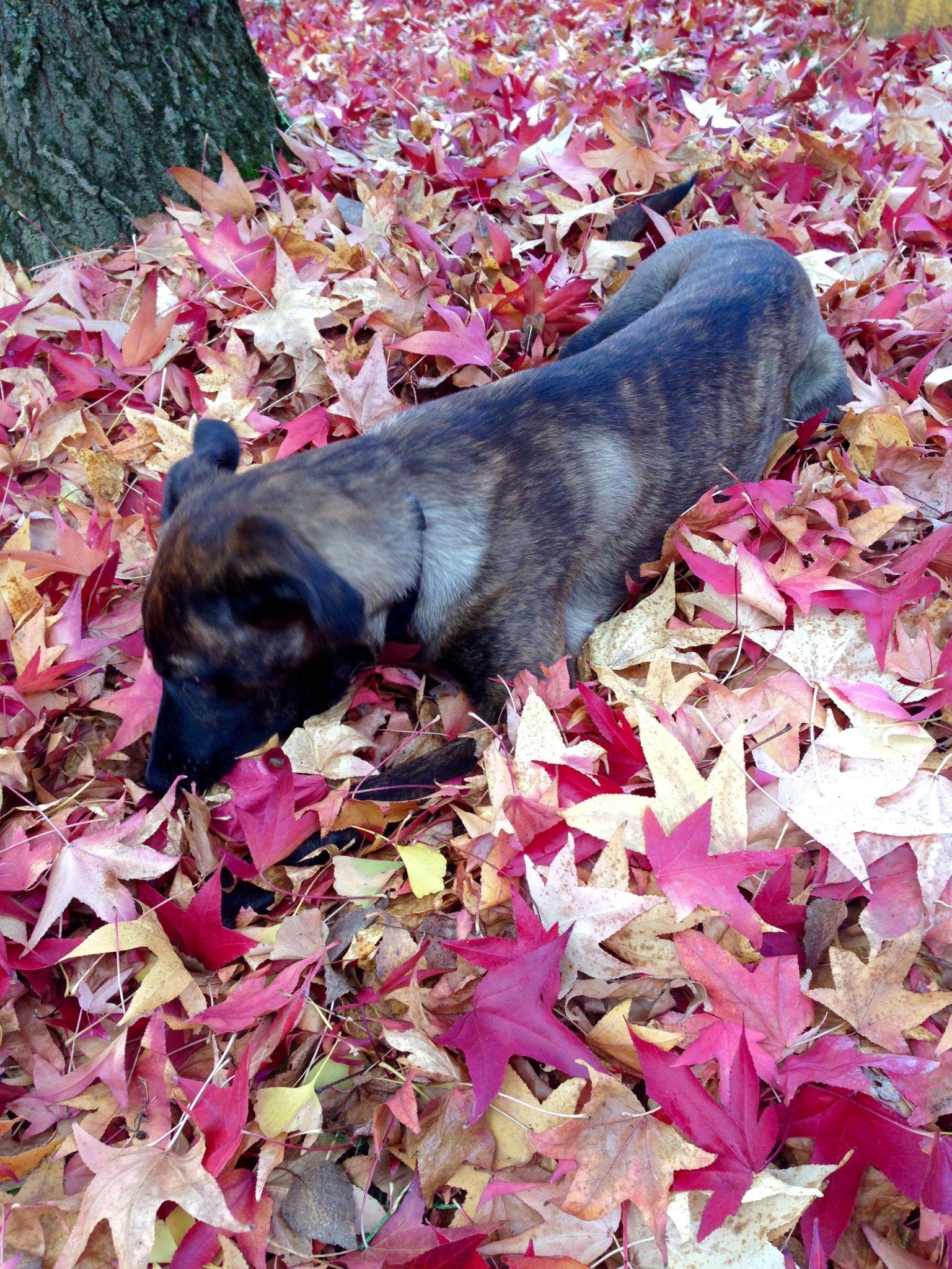 Color matching: A brown dog lying in autumn leaves or a white dog against snow.